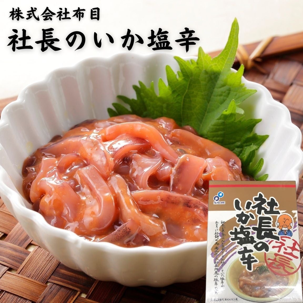 当時、メーカー「布目」の社長がお取引様への手土産としてお配りしていた塩辛が好評だったため、「社長のいか塩辛」として一般に販売した物になります。