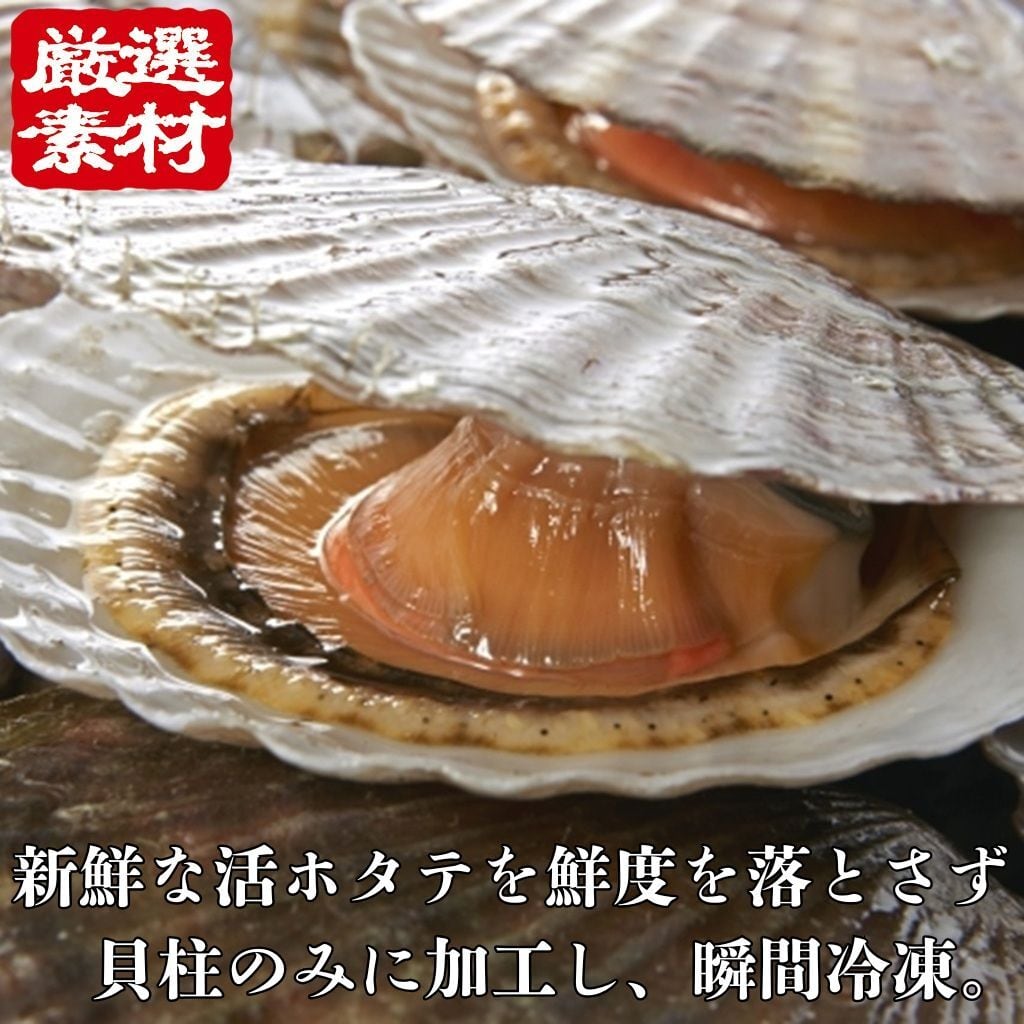 北海道産のホタテを貝柱だけに加工し、急速冷凍をかけて鮮度と美味しさを保持しております。